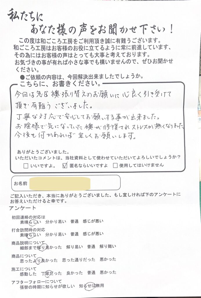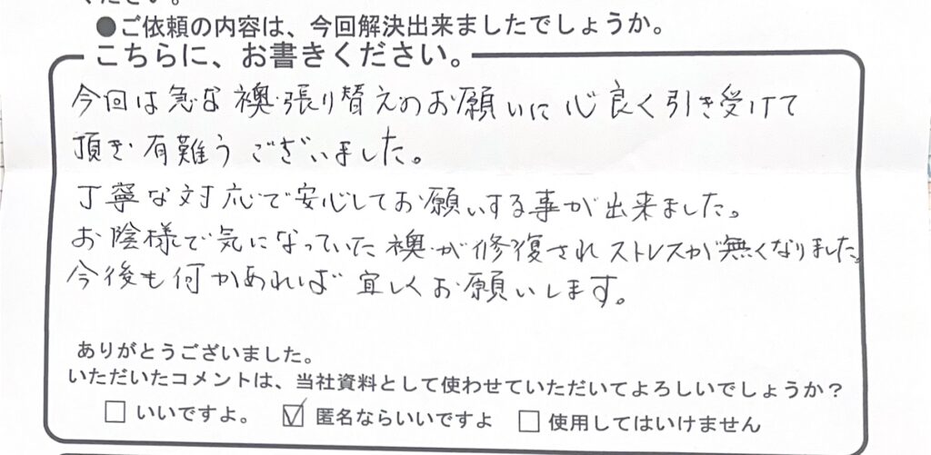 中野のTさんからのコメント紹介 2026年1月24日 最終更新日時 : 2026年1月24日 wagokoro 今回は急な襖の張り替えのお願いに心良く引き受けて頂き有難うございました。 丁寧な対応で安心してお願いする事が出来ました。 お陰様で気になっていた襖が修復されストレスが無くなりました。 今後も何かあれば宜しくお願いします。 FacebookXBluesky