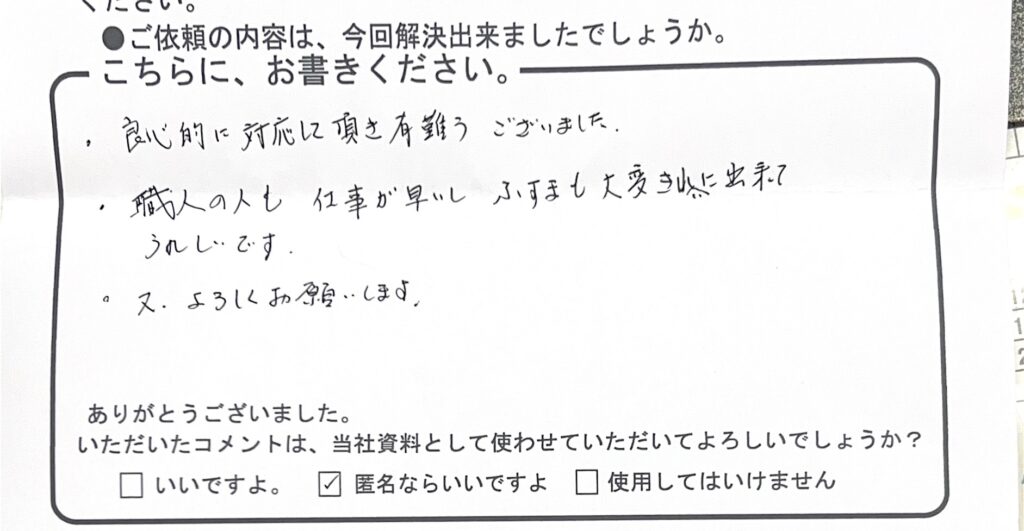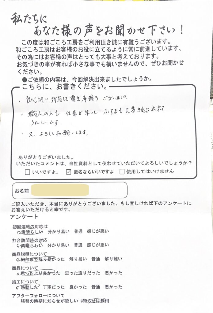 海田町のMさんからのコメント紹介 2026年1月24日 最終更新日時 : 2026年1月24日 wagokoro 良心的に対応して頂き有難うございました。 職人の人も仕事が早いしふすまも大変きれいに出来てうれしいです。 又、よろしくお願いします。 FacebookXBluesky