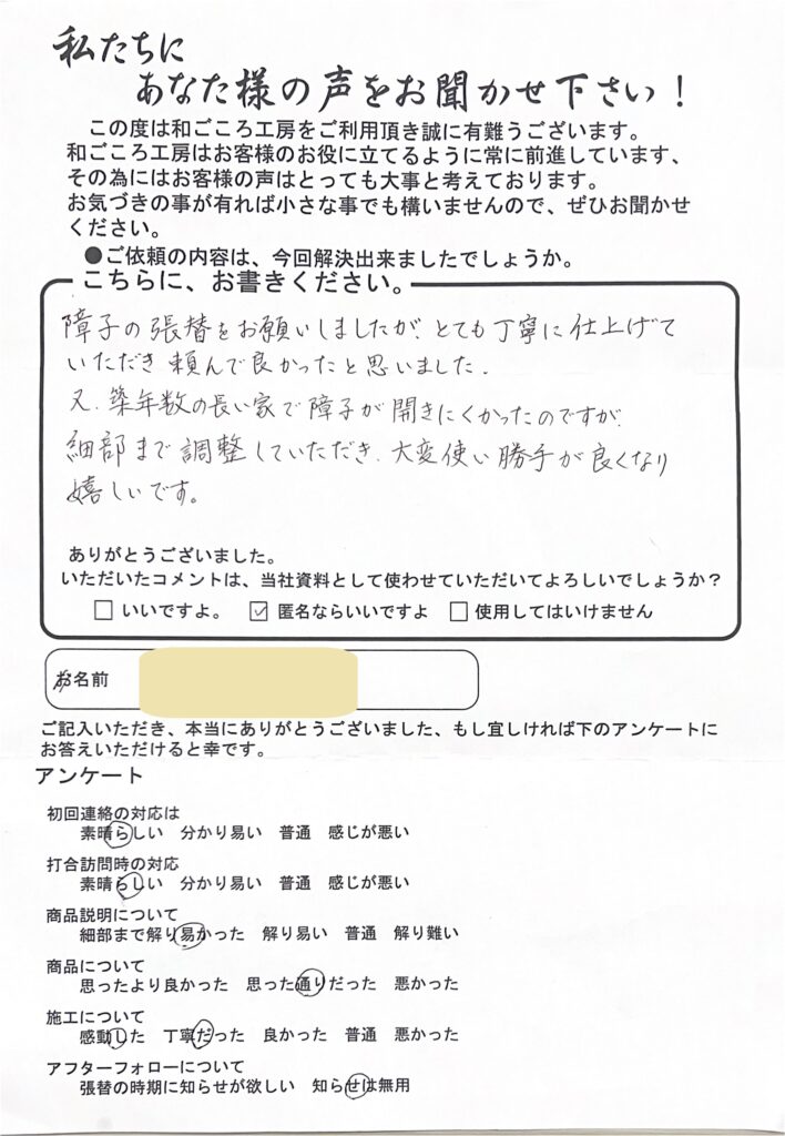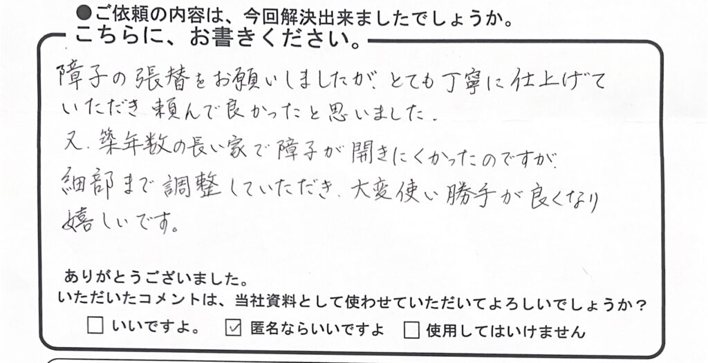 南区のYさんからのコメント紹介 2026年1月24日 最終更新日時 : 2026年1月24日 wagokoro 障子の張替をお願いしましたが、とても丁寧に仕上げていただき頼んで良かったと思いました。 又、築年数の長い家で障子が開きにくかったのですが細部まで調節していただき大変使い勝手がよくなり嬉しいです。 FacebookXBluesky