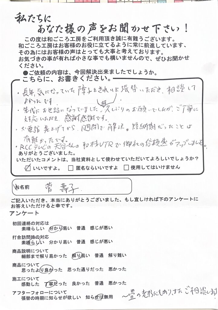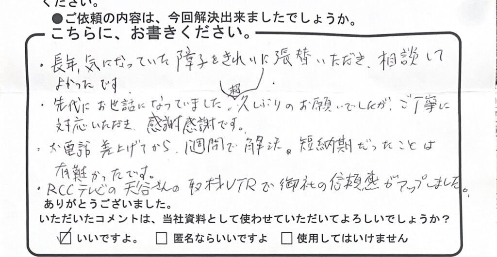 長年、気になっていた障子をきれいに張替いただき、相談してよかったです。