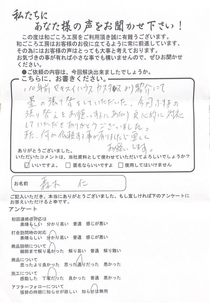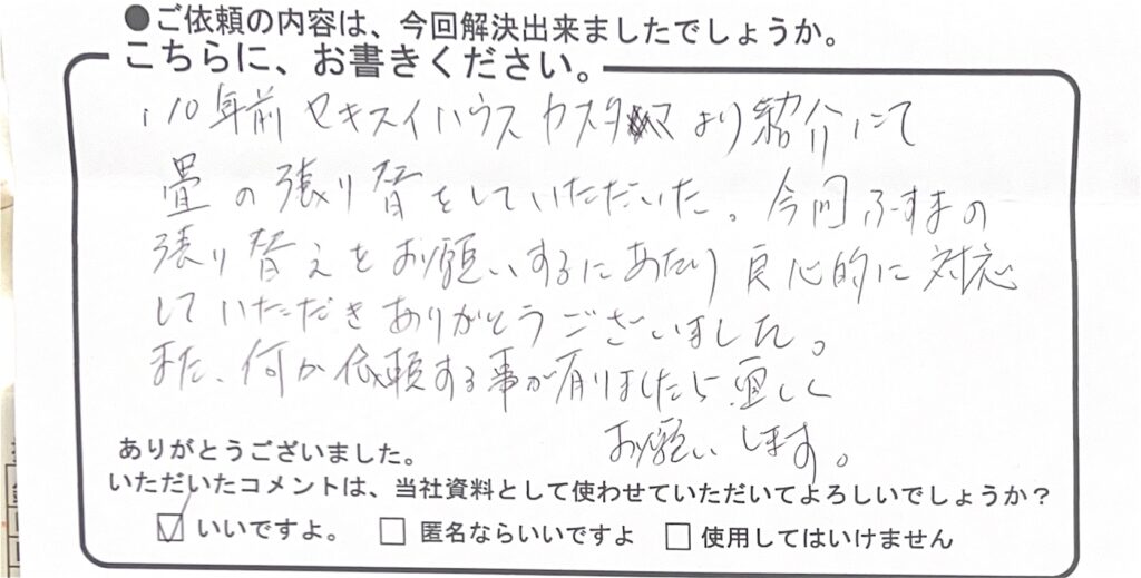 上瀬野の森木さんからのコメント紹介 2026年2月4日 最終更新日時 : 2026年2月4日 wagokoro 10年前セキスイハウスカスタマーより紹介にて畳の張り替えをしていただいた。今回ふすまの張り替えをお願いするにあたり良心的に対応していただきありがとうございました。 また、何か依頼する事が有りましたら宜しくお願いします。 FacebookXBluesky