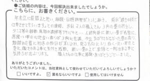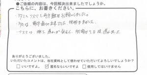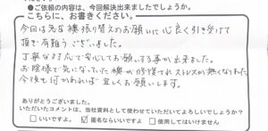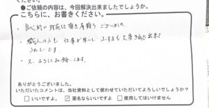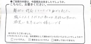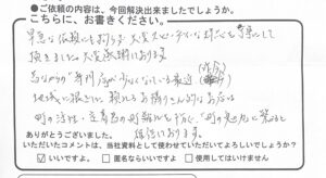 前にもお願いした時に、すぐにやって頂きましたので、又、お願いしました。仕事をして下さった方も、気持よく対応して下さって、きれいに仕上がってたので、又、お願いしたいと思います。