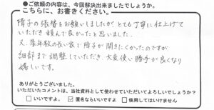障子の張替をお願いしましたが、とても丁寧に仕上げていただき頼んで良かったと思いました。 又、築年数の長い家で障子が開きにくかったのですが細部まで調節していただき大変使い勝手がよくなり嬉しいです。