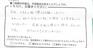 今回、ふすまの貼り替えをお願いしました。 きれいに柄を合わせて貼って頂き、とてもきれいになりました。 金具も取り替えて頂き、よかったですありがとうございました。