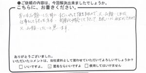前にもお願いした時に、すぐにやって頂きましたので、又、お願いしました。仕事をして下さった方も、気持よく対応して下さって、きれいに仕上がってたので、又、お願いしたいと思います。